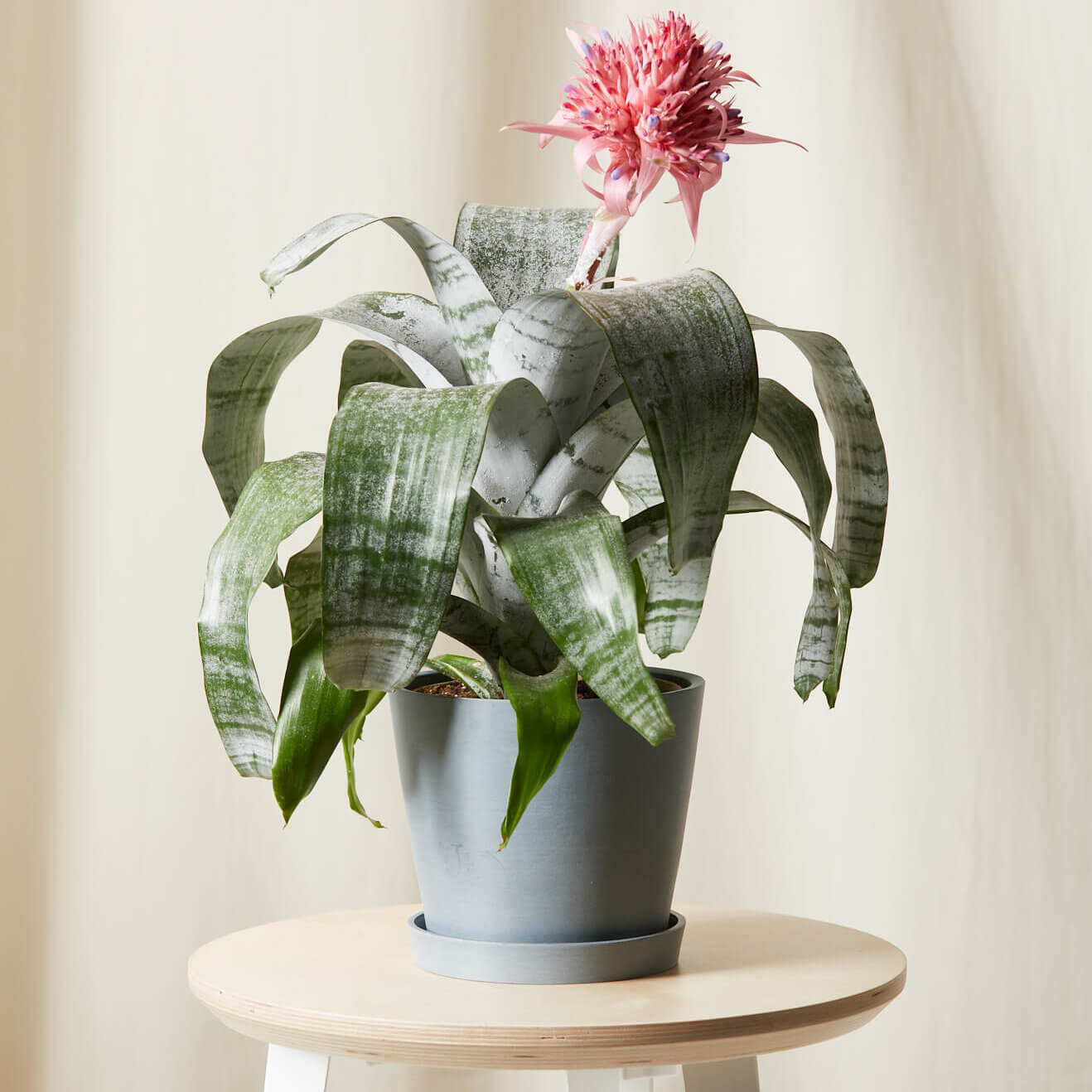Bromeliad Aechmea Pink may not be as unique as its pineapple cousin, but its colorful, long-lasting flowers are sure to make a statement. The blooms on these bromeliad flowers last up to six months and lend a laid back, staycation vibe to any home or apartment. Even when not in flower, the waxy coating on the wide leaves creates an eye catching two-toned effect. Bromeliad Aechmea Pink plants are actually epiphytes, a type of air plant, and therefore develop minimal roots and derive nutrients from the air and rainfall.