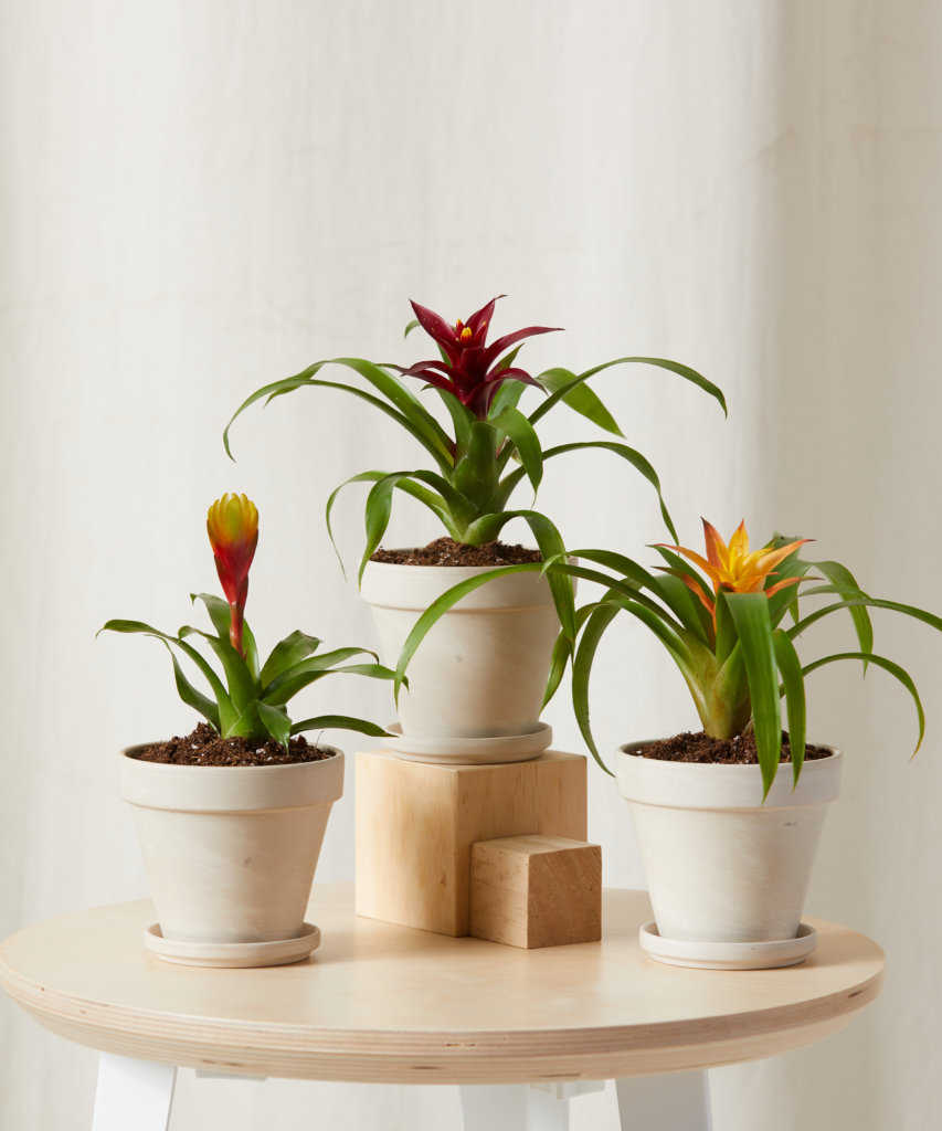 Can’t decide on just one beautiful bromeliad? Try three with our Bromeliad Collection, featuring a bright trio of Vriesea- and Guzmania-type bromeliads. This grouping allows you to add a range of tropical color to your home—just find a bright spot out of direct light, and these plants will grab everyone’s attention with their long-lasting blooms. Guzmania Sky features a scarlet red flower, Guzmania Lydia flaunts an electric yellow bloom, and Vriesea Tosca shines with a bicolor red and yellow spike.