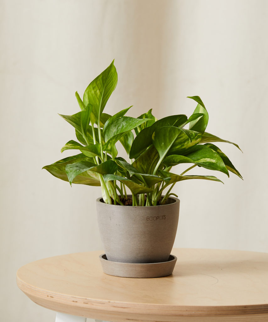 Place your pothos in a hanging pot or put it on a bookshelf and watch its elegant vines cascade down. The pothos is happy in bright, indirect sunlight and prefers to be watered when the soil volume is half dry.