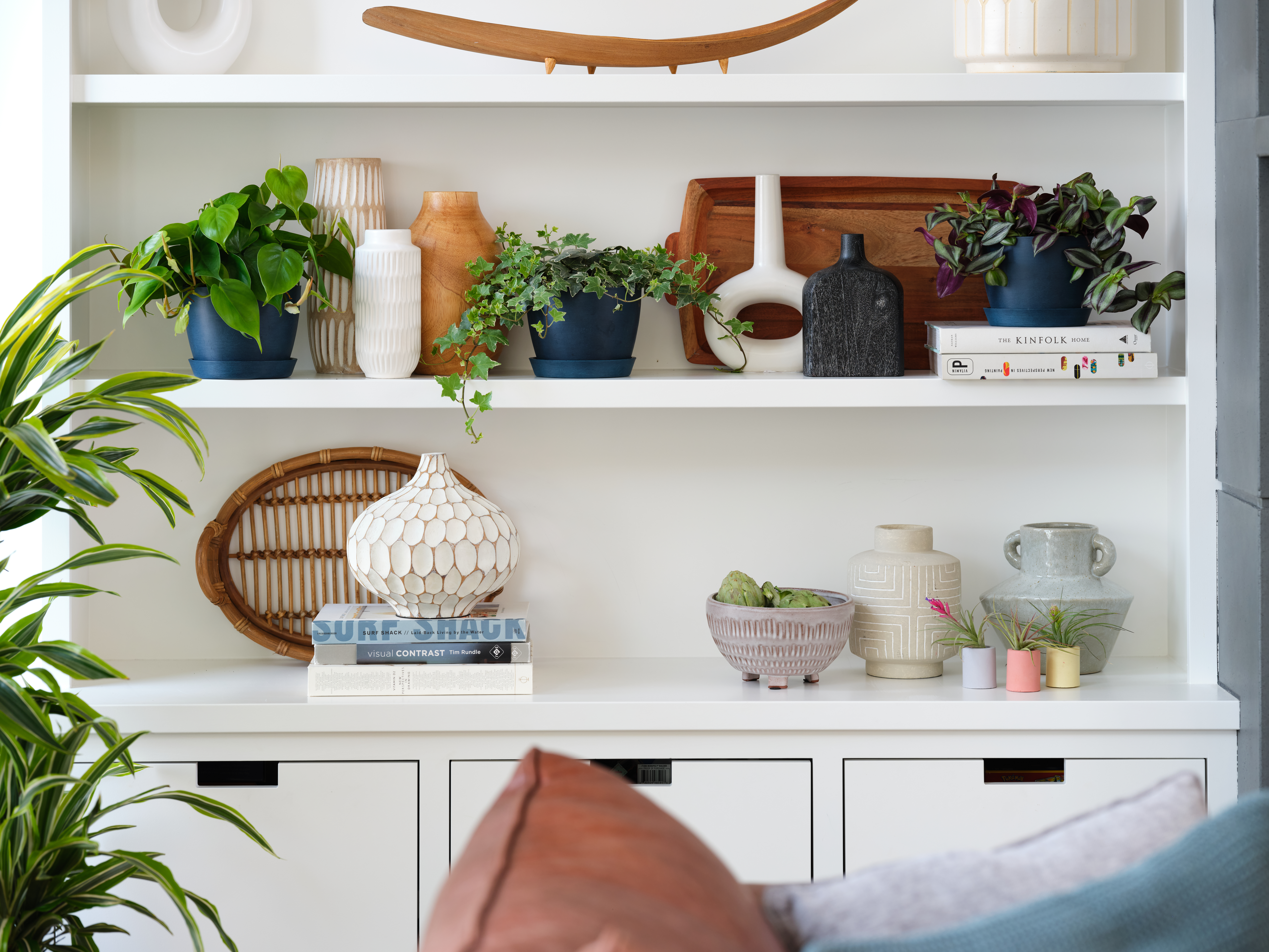 Whether you grow them in pots or baskets, it’s easy to sneak a trailing plant into almost any decor scene. Vining plants soften the edges of bookshelves, floating shelves, and mantles.